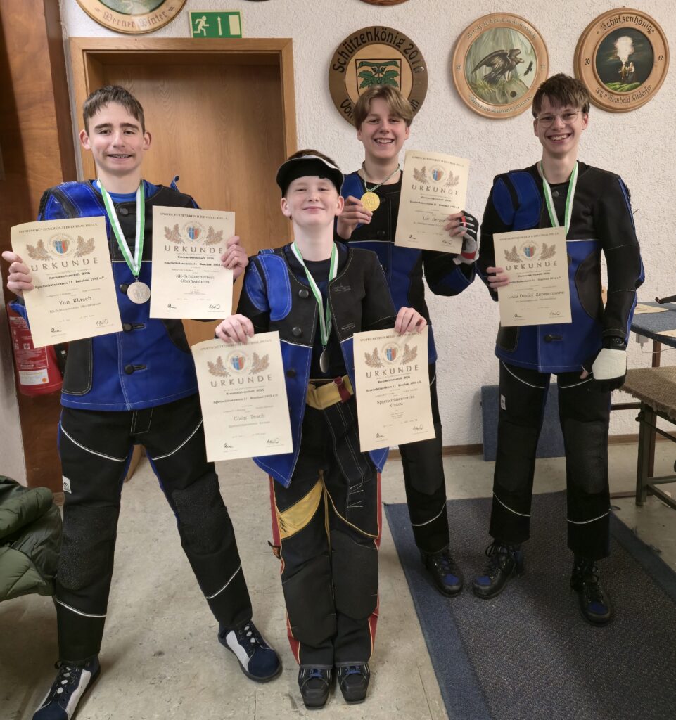 Nach den stehenden Disziplinen ging es mit den Kreismeisterschaften im Dreistellungskampf weiter. Dabei treten die Schützen in der Reihenfolge knieend, liegend und stehend an. Die Jüngsten absolvierten den Wettkampf mit dem Luftgewehr, alle anderen mit dem Kleinkaliber. Unsere Jugend konnte dabei richtig überzeugen: Colin Tesch, der zum ersten Mal teilnehmen durfte, erreichte starke 549 Ringe und wurde damit Zweiter in der Schülerklasse. In der Jugendklasse waren nur Schützen des KKS am Start. Hier holte sich Lee Berger mit hervorragenden 550 Ringen den ersten Platz und damit Gold. Dahinter sicherte sich Yan Klitsch mit 544 Ringen Silber, gefolgt von Luca Zimmermann auf dem Bronzeplatz. Besonders erfreulich: Im Vergleich zum Vorjahr konnten sich die Jungschützen insgesamt um 20 Ringe steigern. Jo-Ann Tesch trat für den KKS Ispringen in einem anderen Schützenkreis an und erzielte dort eine neue persönlichen Bestleistung von 570 Ringen, was ihr den ersten Platz einbrachte. Auch in der Schützenklasse konnte der KKS einige Medaillen holen. Christian Butz und Monik Bauer sicherten sich jeweils den ersten Platz in ihren Klassen. Bei den Herren holte Patrick Tesch zudem Silber. Leon Stephan musste sich knapp mit 552 Ringen dem undankbaren vierten Platz zufriedengeben, während Yanick Kooß, der erstmals in der Herrenklasse antrat, mit 533 Ringen den sechsten Platz belegte.